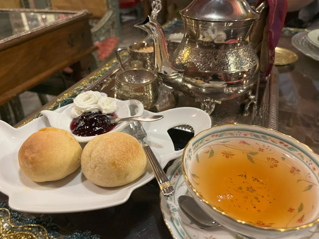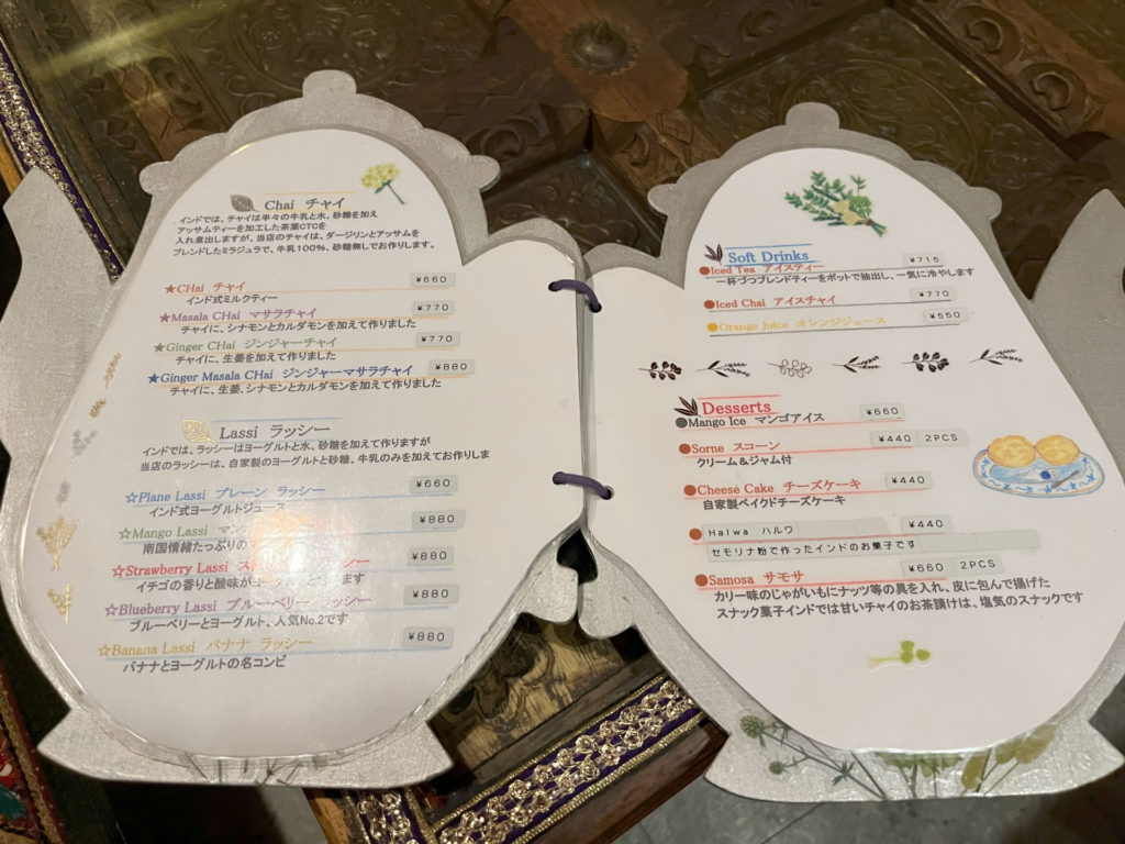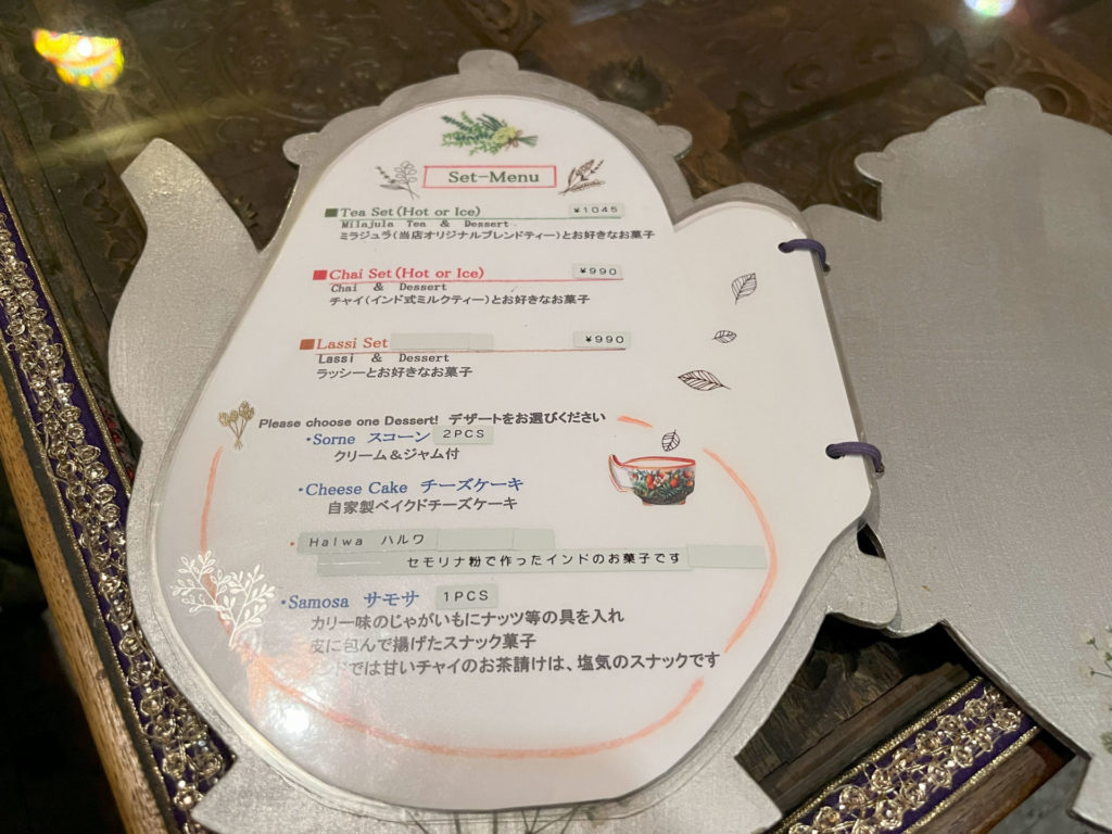 初手でカレーなどを頼まず「紅茶&デザートセット(1,045円)」に浮気。お茶やチャイやラッシーも種類豊富です。デザートはスコーン、チーズケーキ、ハルワ(インドのお菓子)、サモサから選べてこの値段。紅茶はズシンとたっぷり入ったポットで出てきて何杯もいただけてしまう。