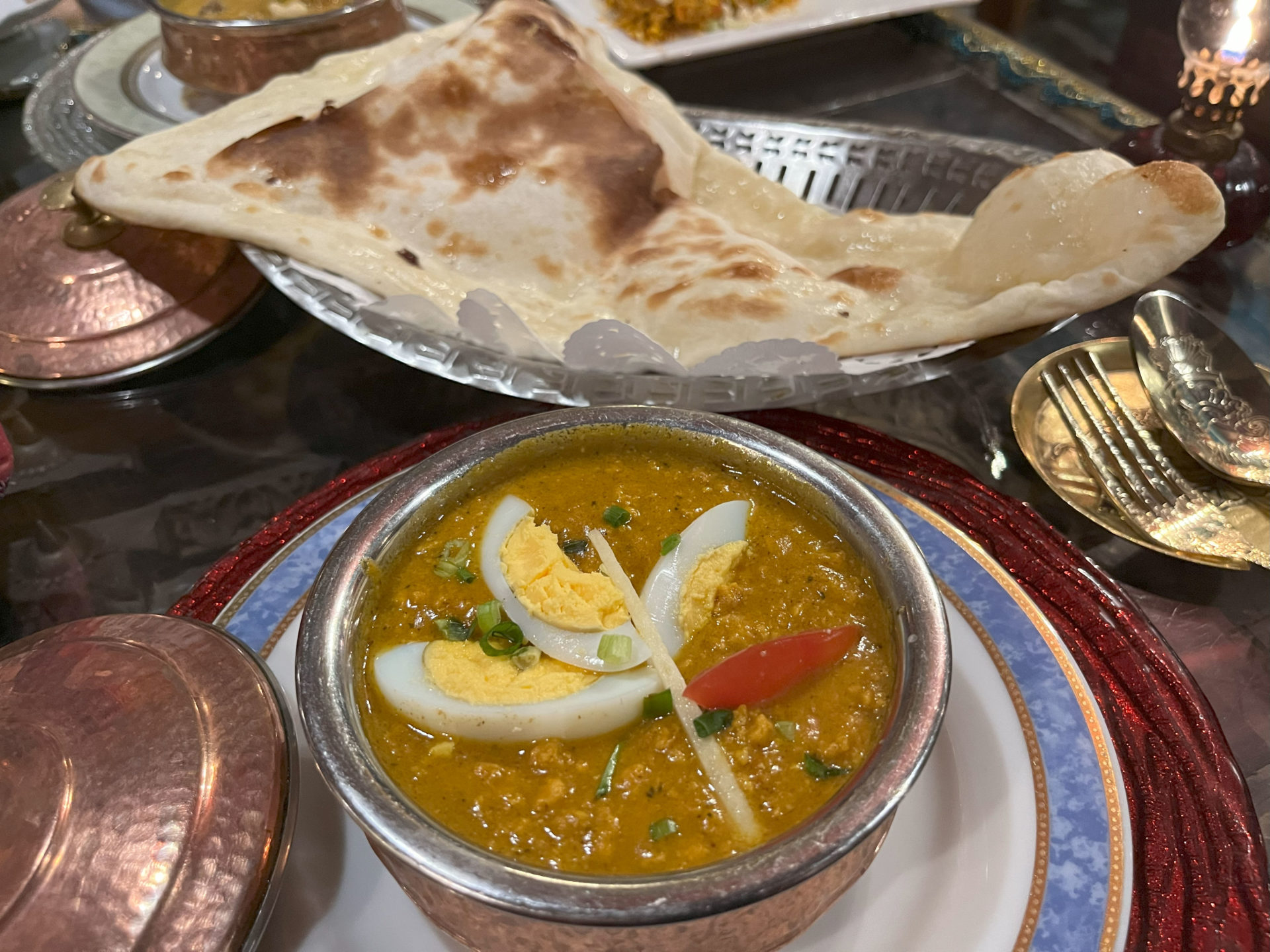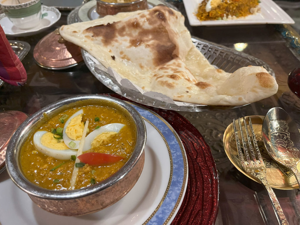 カレーはポットにたっぷり、ナンも巨大なもの。ナンが香ばしくて、むかし新宿にあった名店「ポンペイ」のナンと同じにおいがして懐かしい感じ。タンドゥールの差なのか生地の具合なのかは不明。