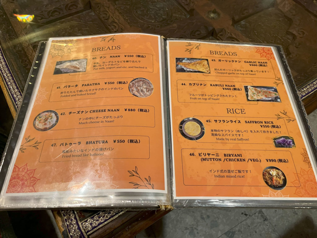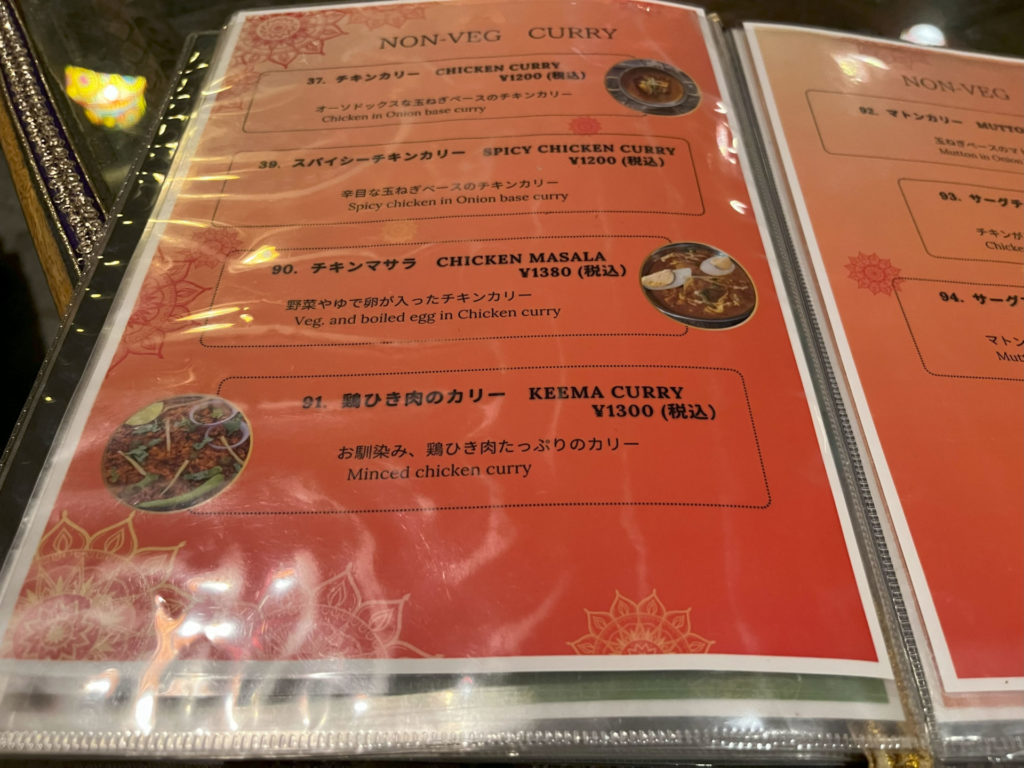 カレーも種類豊富。注文は鶏ひき肉のカリー。どれも普通のインド&ネパールカレー屋さんに比べて高めのお値段。付け合せもナン以外が気になったので、ナンとパラータ(パイ生地みたいなサクサク食感のパン)、珍しいのはライスがターメリックではなくサフランライスでこれを頼みたかったのだけどこの日は品切れとのこと。かわりにビリヤーニ(990円)を選択。ナンも550円と普通のお店より高めです。