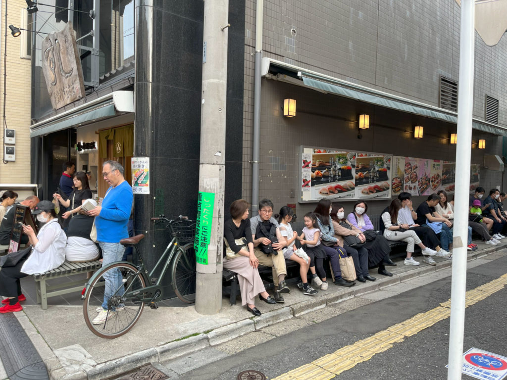 やって参りました、梅ヶ丘は美登利寿司総本店。地上の楽園美登利寿司の存在はあまねく知れ渡っているのでいつきても大行列。15時の段階で19組待ちでした(入店は17時)。総本店は入口の脇に待合用ベンチが設けられています。