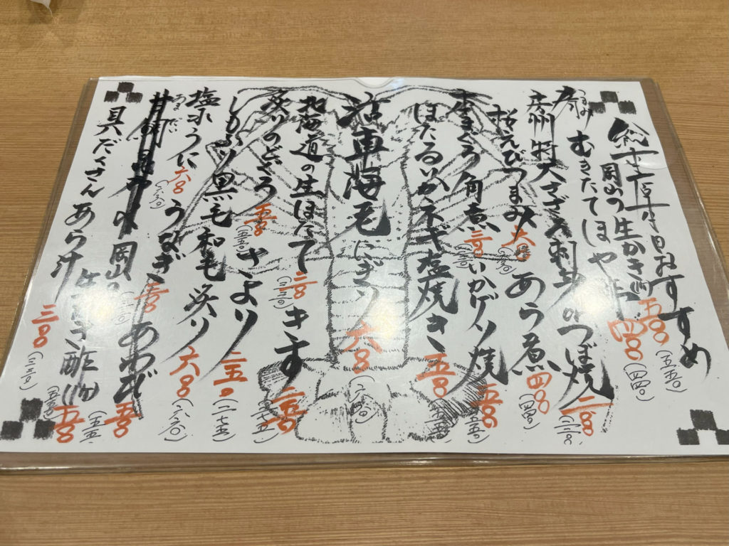 本日のおすすめ。夕方の時間では人気のお寿司はほぼ売り切れでした……。炙りのどぐろ食べたかったなあ。本日は総勢5人。アラカルトで好きなものを頼みまくって好きなように食べていくスタイルです。