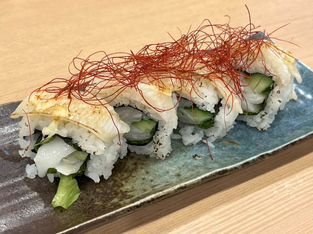 炙りエンガワ巻き。エンガワの脂がてろってろに染み出し、水分も抜けてプリプリの食感。