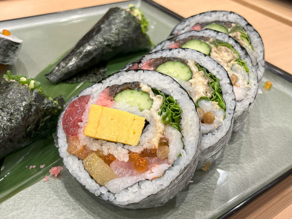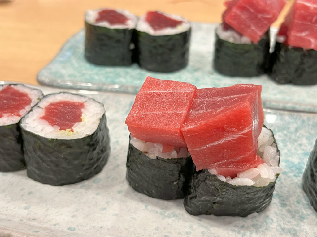 初手は板さんのおすすめ巨大鉄火。良質でコクの深いホンマグロの赤身がずどんと乗っかり、ただの鉄火巻も満足感がすごい。