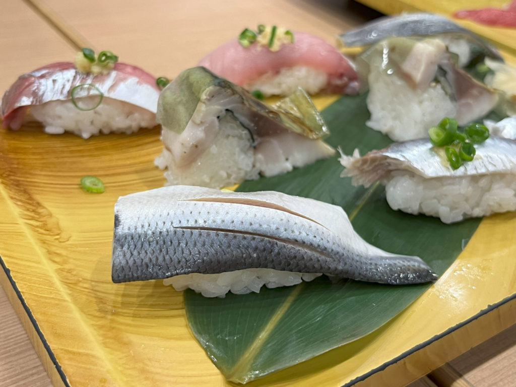 続いて光り物づくし。コハダ、アジ、イワシ、大名サバ寿司のセット。青物が苦手な人でも美登利寿司のは食べられるといわせしめる臭みのなさ。
