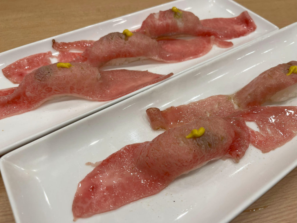 和牛寿司。薄切りの上質な和牛寿司で、口の中に入れた瞬間からとけだす脂の甘みがすごい。今日イチ美味しかったという発言がちらほら……。