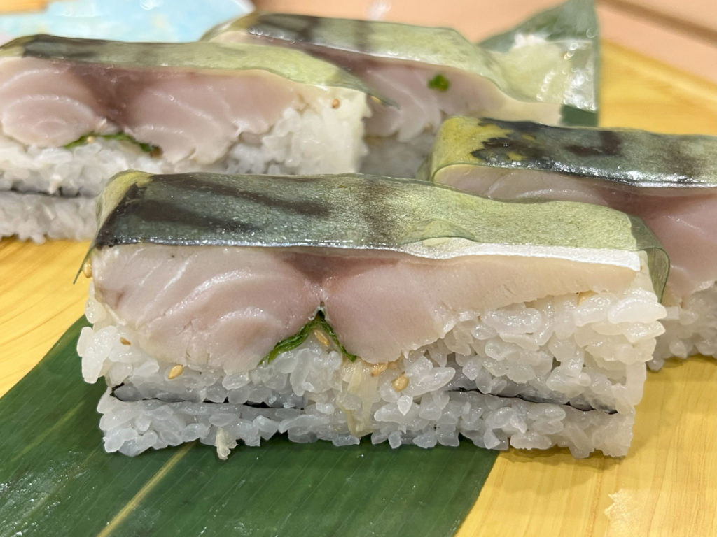 美登利寿司名物、大名サバ。肉厚で脂ののったサバを大きめにカットした押し寿司。がぶりと食らいつくとじゅわっと脂が染み出す官能品。タイセイヨウサバに見えるのでノルウェーサバでしょうかね。
