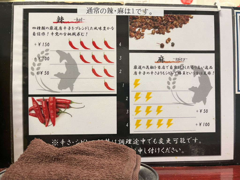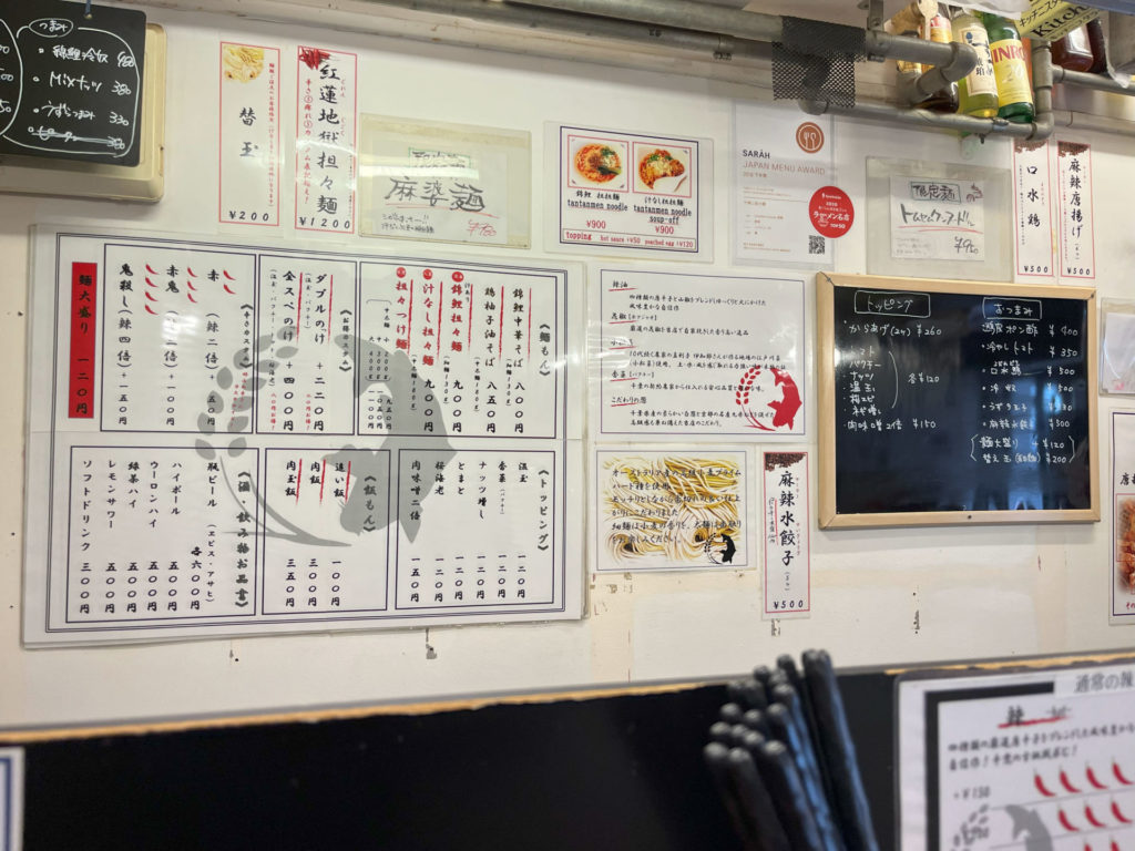 メインは「汁あり錦鯉担々麺」「汁なし担々麺」「担々つけ麺」。他に辛くないラーメンもあり。でもここに来たならやっぱり担々麺を食べたくなりますね。そしてお店のイチオシが「汁あり錦鯉担々麺」ということになります。