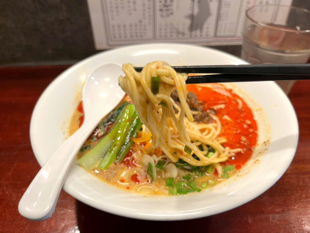こちらの担々麺の魅力はスープ。派手な見た目だけれどスープ自体はシンプルな作りで、具を混ぜても芝麻醤の香りと旨味が残ります。あっさりめに仕上がっているため麺の味と香りが活き、このスープをたっぷり絡めた麺をバサバサと食べていくわけです。