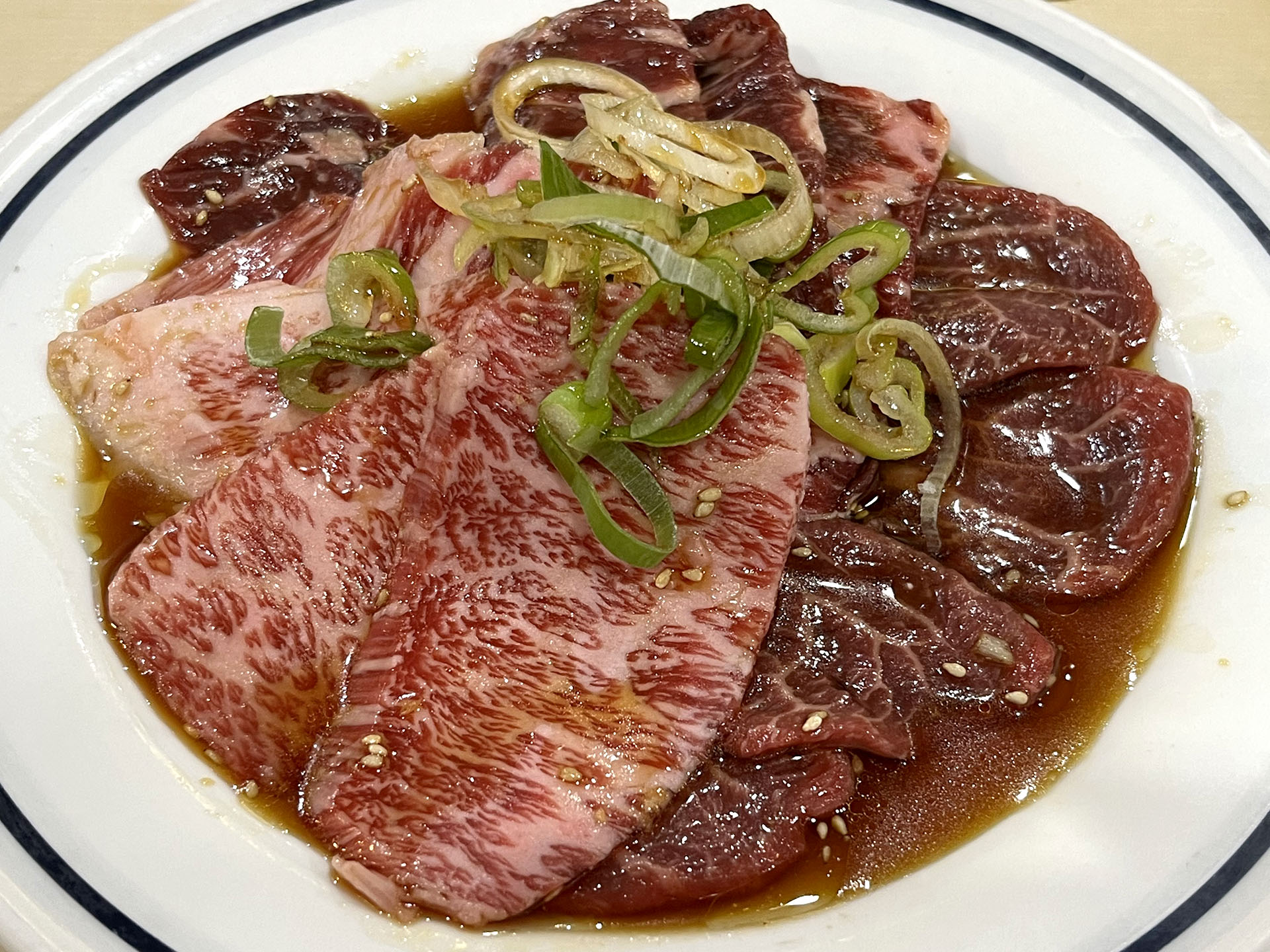 予想通り注文した品もすぐに出てきた。サッと出された和牛セットは看板通りの盛りでカルビ、ロース、ハラミがこれでもかと並ぶ。テグタンスープは大きな丼に具だくさんで小山のようになっているし、カルピスサワーはでっかい大ジョッキになみなみと注がれている。すべてが昭和感覚のままで、今日のジャケ買いは大成功でほくほく。