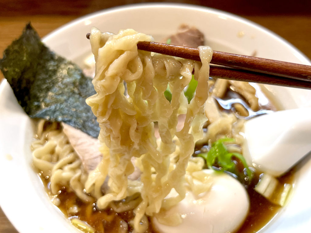 トッピングに追加した味玉はよくスープの醤油が染みて、とろりとした滋味はスープと合わせて楽しめる。