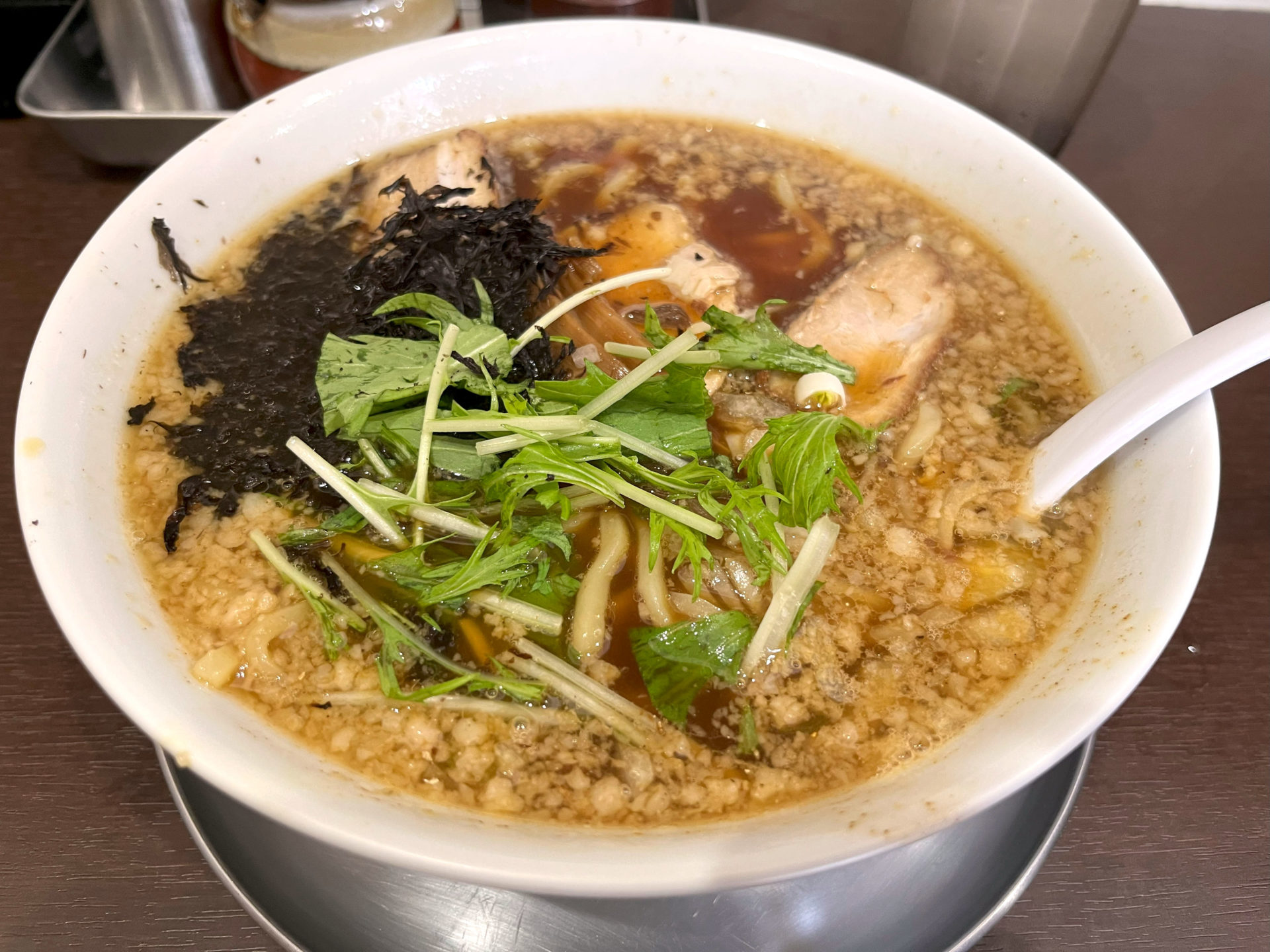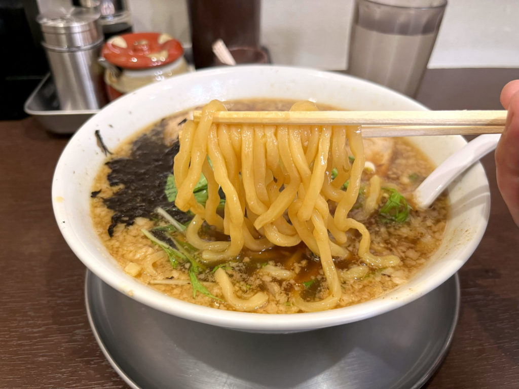 具は他に岩のり、刻み玉ねぎ、水菜、煮豚、メンマ。豚はしっかり醤油に浸かった味の濃いもの。岩のりと玉ねぎはそれぞれ香りと味にグラデーションを生む役割を果たしていて、混ぜながら食べると味変を楽しめる。ニンニクも途中で足すのをおすすめします。
