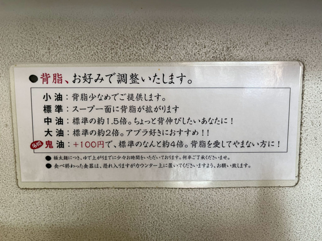 「らーめん こばやし」では、注文時に背脂の量を調節できる。「標準」だとやや少ないと感じるかもしれない。というのも麺だけでなく具にかなり脂が絡むのですぐになくなってしまうからだ。好きな方は「中油」以上がおすすめです。