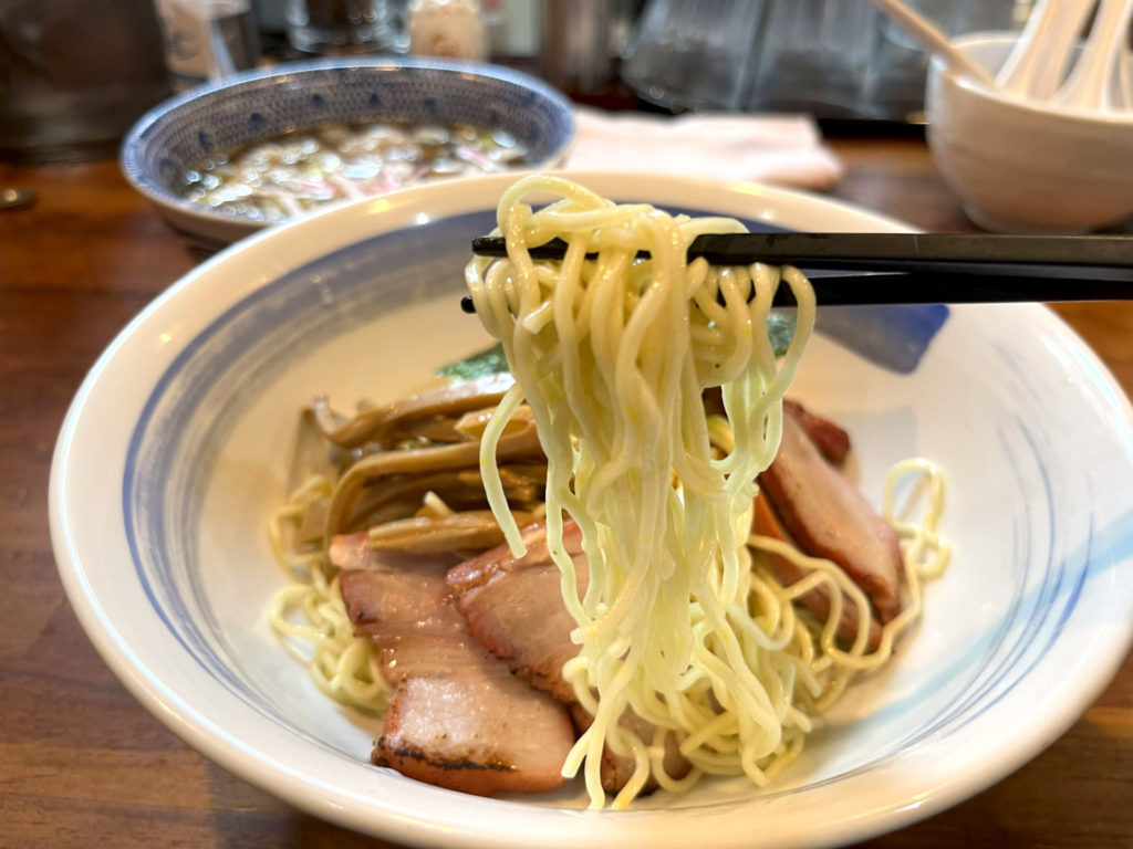 麺は少し揉んだストレートの細麺で、ぱつっとした歯ごたえが楽しめる。味と香りは特に主張せず、スープの味わいが立つようになっている。ジューシーな炙り焼豚やワンタンといっしょに食べてみるのがおすすめ。豚のクオリティの高さを楽しめる。
