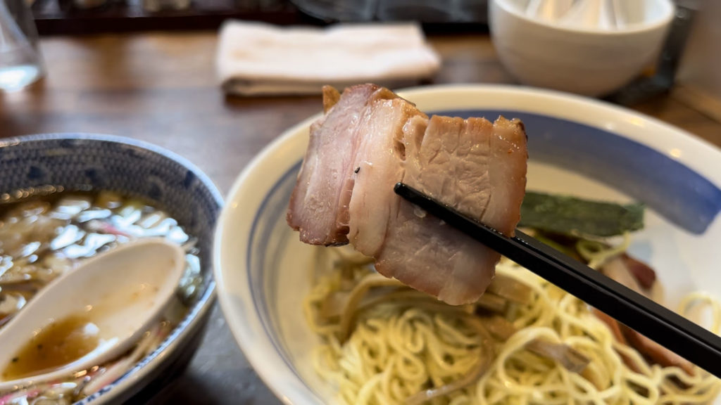 かづ屋フォロワーなら外せない「チャーシューとワンタン」を足すのも忘れない。かづ屋のチャーシューは「焼豚」と書く本式中華の炙り焼き豚で、煮豚とは味わいがまるで違う。当然悠のチャーシューもほぼ同じものと思われるが、食紅の色味が薄く、仕上げは少し異なる。また、これを提供前に炙って出してくれることで香ばしさが更に加わり、麺に豚の香りがふわっと被さり食欲を刺激する。