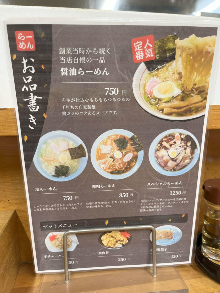 メニューがこちら。中華丼や焼きそば、冷やし中華ほか定食なんかもあって、ラーメン屋さんというよりは中華料理屋さんといった感じ。注文はチャーシュー麺に餃子にしてみました。