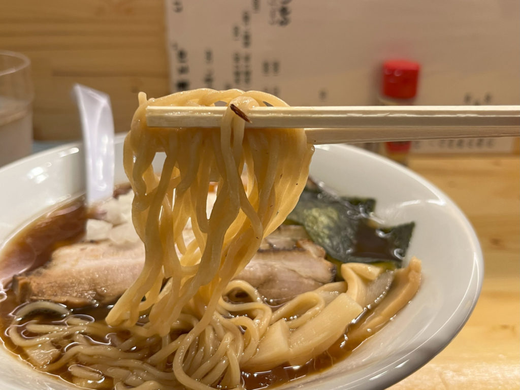 特筆すべきは2点。スープはほんのり薄濁りで濃い醤油色。見た目ほど味は濃くないですが鶏出汁とその他が組み合わさりコクと美味しいエグ味のバランスがいいです。パンチのあるスープです。